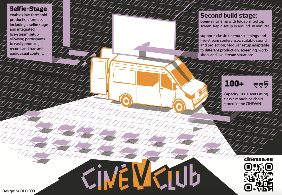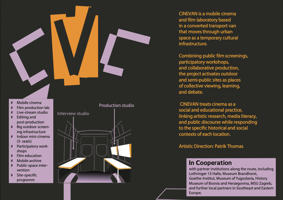 CINEVAN is a mobile cinema and film production platform developed by Patrik Thomas. Conceived as a hybrid of exhibition space, workshop, archive, and traveling cinema, the project uses a converted van equipped with projection, sound, and screening infrastructure to bring film practice directly into public space.